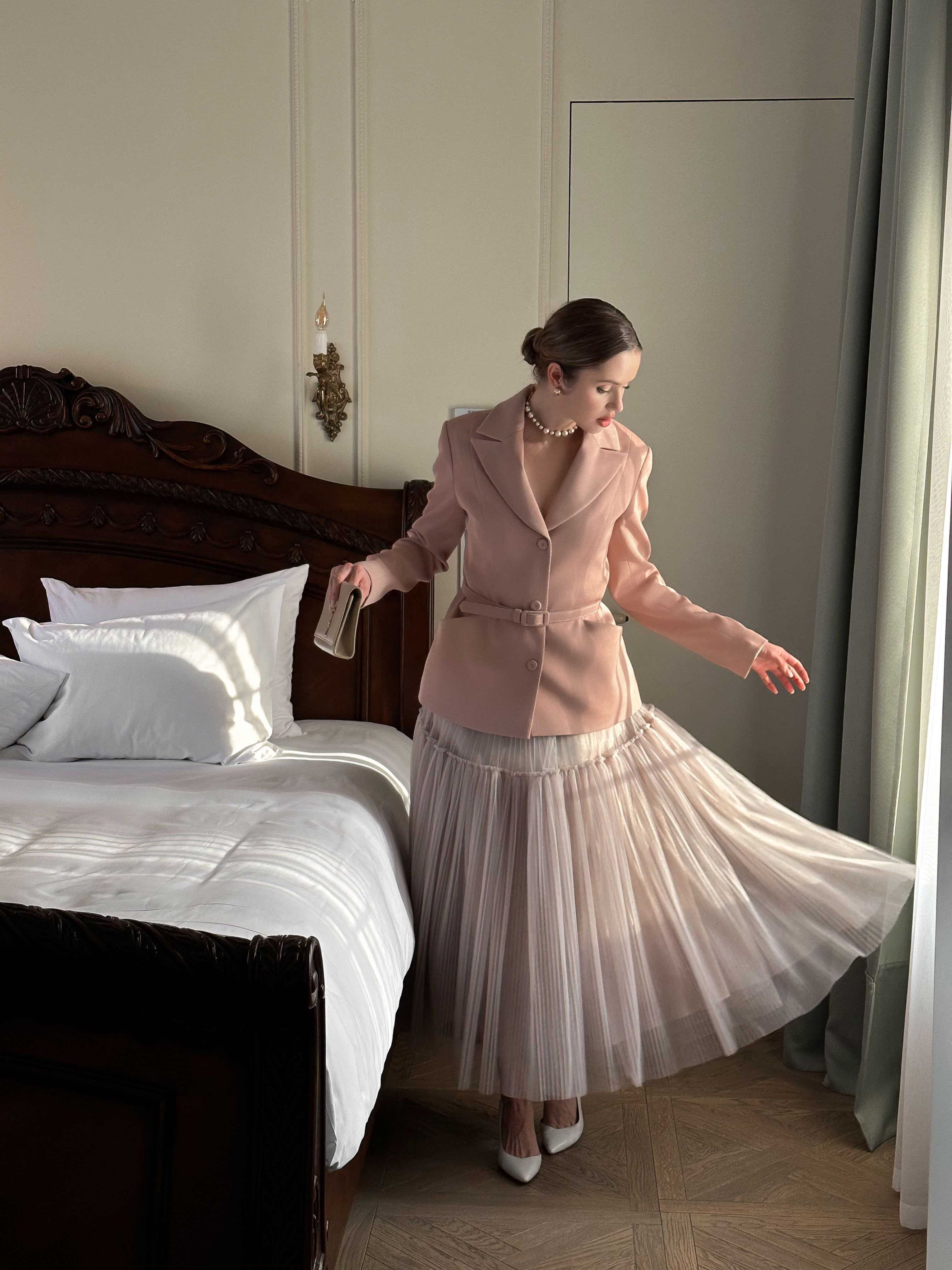 - Платье с рюшами + жакет: Комбинация Pin Up платья и лаконичного жакета создаёт элегантный, сбалансированный образ. Выбирайте жакет в классическом стиле и светлых тонах - сливочный, белый, нежно-розовый.